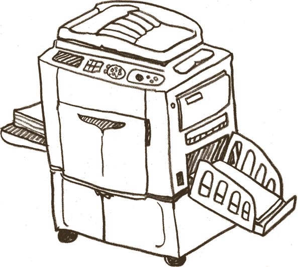The risograph creates a stencil that is automatically wrapped around an ink drum. When the drum rotates, ink is pressed through the stencil and transferred onto paper as sheets travel through the machine. The soy-based inks used in riso printing are low-VOC and require no solvents or chemicals for cleanup, making riso a uniquely environmentally friendly form of printing.